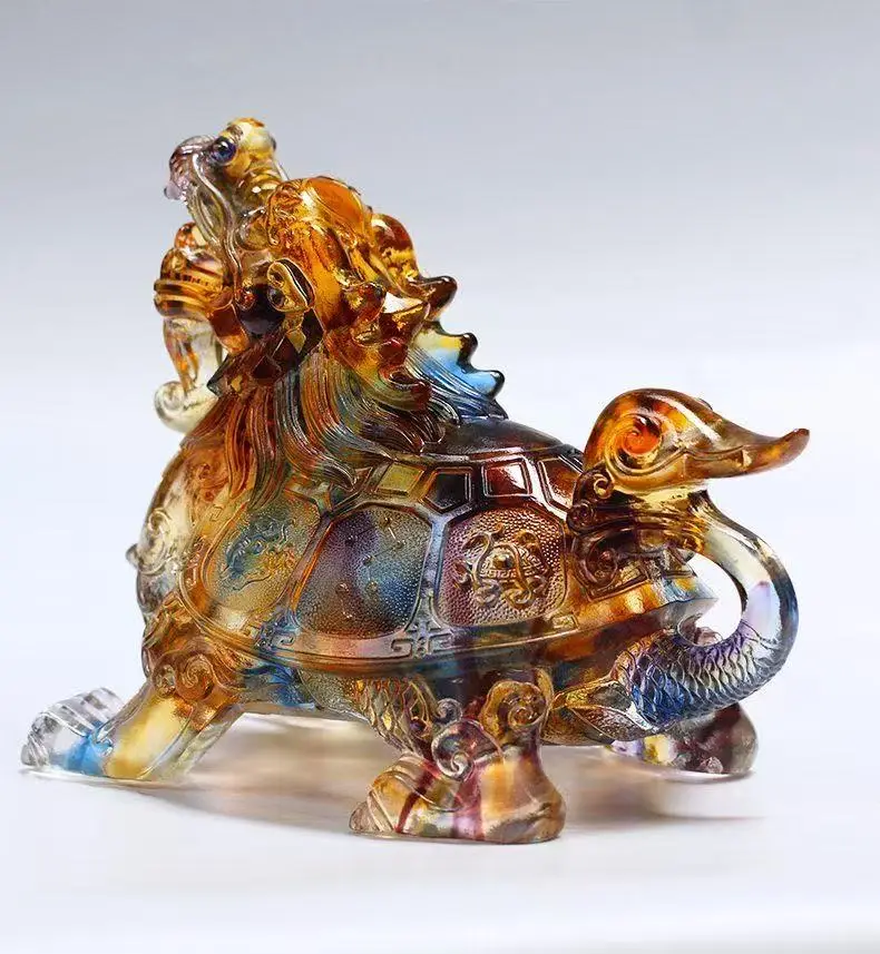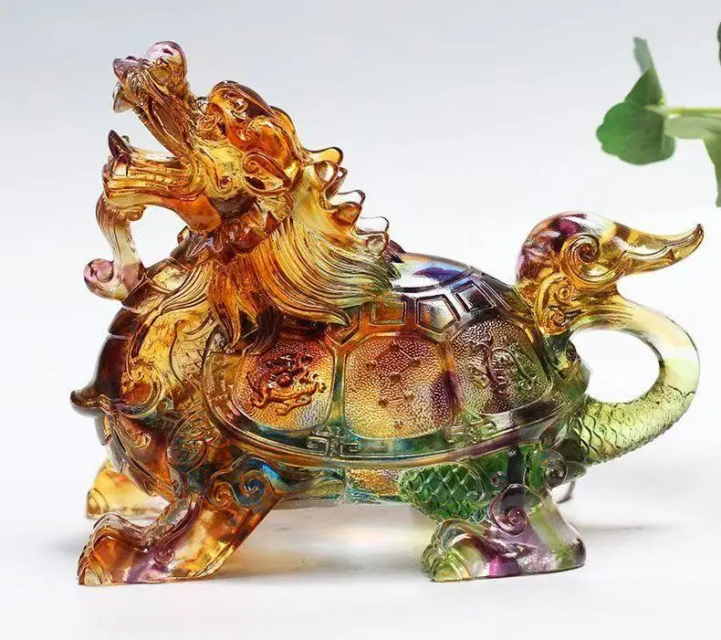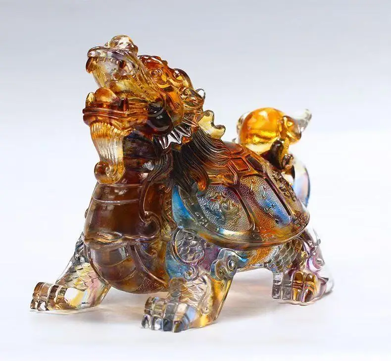 ● Information: 1. The dragon turtle is a mythical creature in ancient Chinese mythology. It is regarded as a symbol of power and wealth, capable of warding off evil, relieving disasters, and attracting wealth. 2. This dragon turtle ornament is made from coloured glaze through various manual processes and is an exquisite artwork. 3. Coloured glaze has rich colors, high transparency and glossiness. Placing this ornament at home not only improves the elegant atmosphere, but also showcases the owner’s taste.